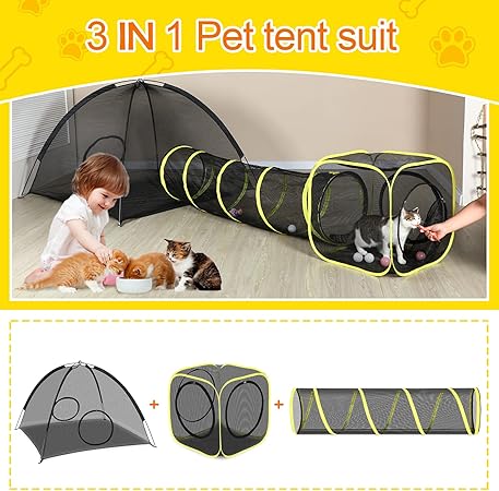 Outdoor Cat Enclosures for Indoor, Portable Mesh Tent, Outdoor pet Tunnel, Cat Playhouse with Adjustable Cat Harness and Leash for Walking, Colorful Tease Ball for Small Animals