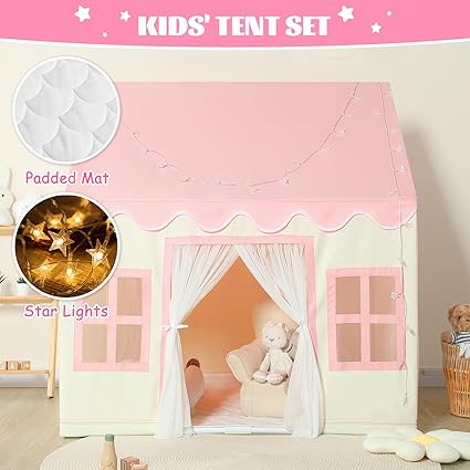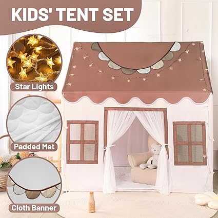 Wilwolfer Play Tent for Kids Indoor: with Mat, Star Lights, Banners - Kids Play Tent Indoor Toddlers Play Tent Large Toddler Tent for Kids Toy House Gift for Boys & Girls