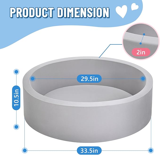 - Product Size: The ball pits for kids diameter is about 33.5 inch, the height is 10.5 inch, and the thickness of the wall is about 2 inch