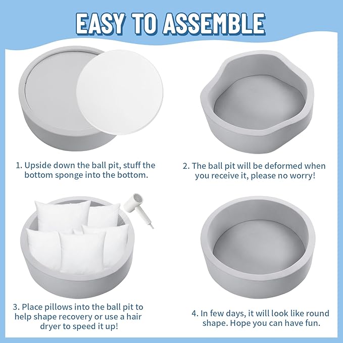 - Vacuum Seal Design: The indoor ball pit is packed in vacuum sealed bags for smart shipment. When you open it, it will expand immediately, but it will not show a perfect shape at once. Stuffing pillows and blankets in the empty baby pool and leaving it for 72 hours will help restore the original shape