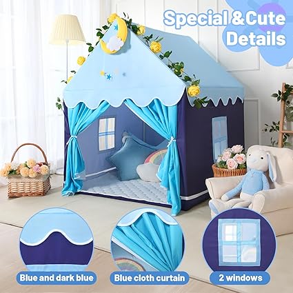 - Blue Color: The cute blue roof adds a cozy touch to this kids play house. Two lovely windows embellished with white mesh and a big doorway with white curtains. It's ideal as a gift for kids or as a decoration for a playroom or bedroom