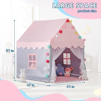 - Pink & Gray Color: The cute pink roof adds a cozy touch to this kids play house. Two lovely windows embellished with white mesh and a big doorway with pink curtains. It's ideal as a gift for kids or as a decoration for a playroom or bedroom