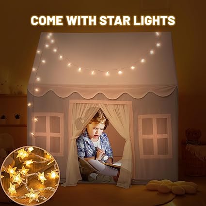 - Star Lights : This play tent for toddlers has a string of star lights. Like a shining fairy tale castle at night, The glittering star lights create a lovely atmosphere. The string of star lights require three AAA batteries to operate, and the batteries are not included
