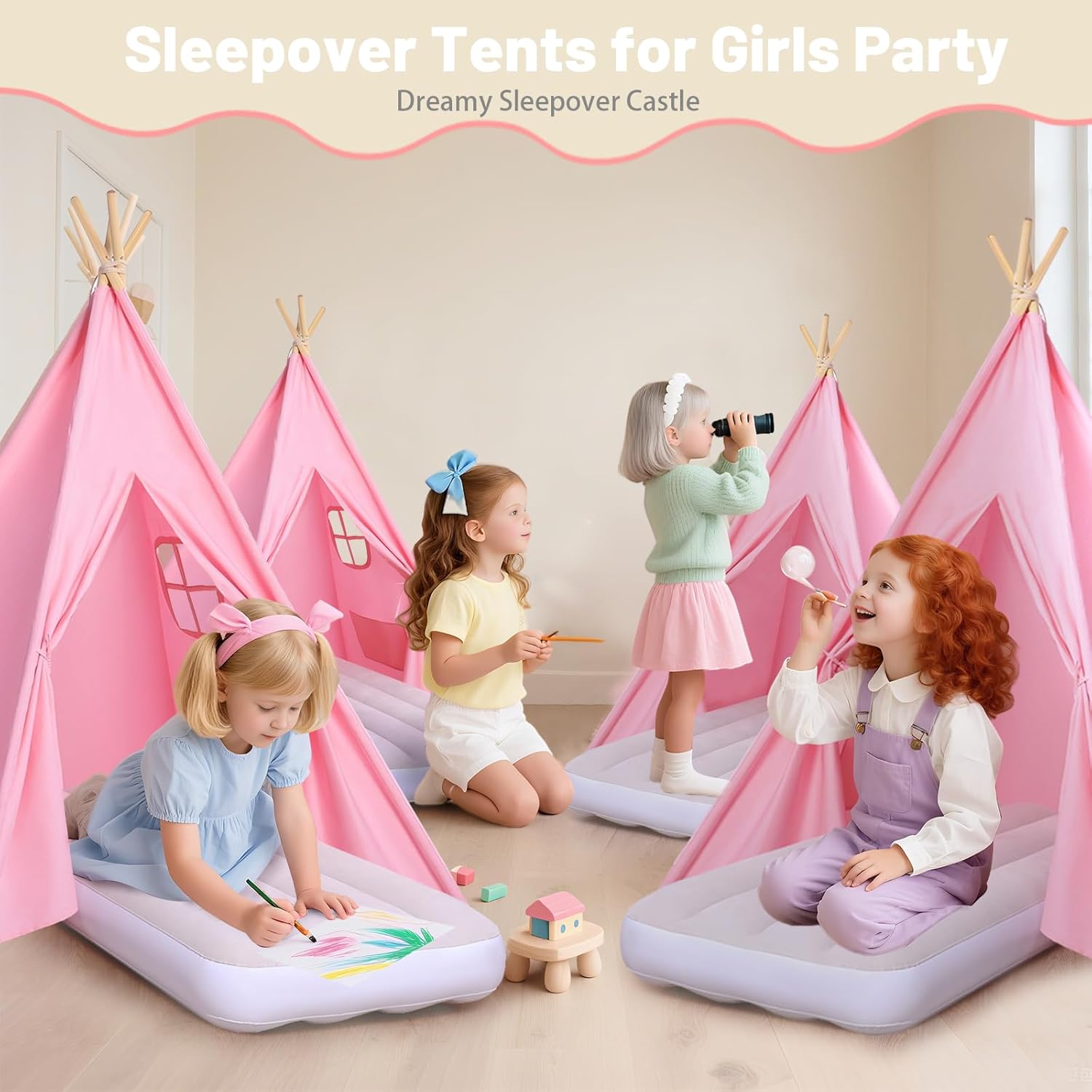 Wilwolfer Sleepover Pink Teepee Tent-4 Pack Tipi Playhouse for Kids with Lights& Flag& Inflatable Airbed -Indoor/Outdoor Foldable -Slumber Party Tent-Sleepover Party Supplies